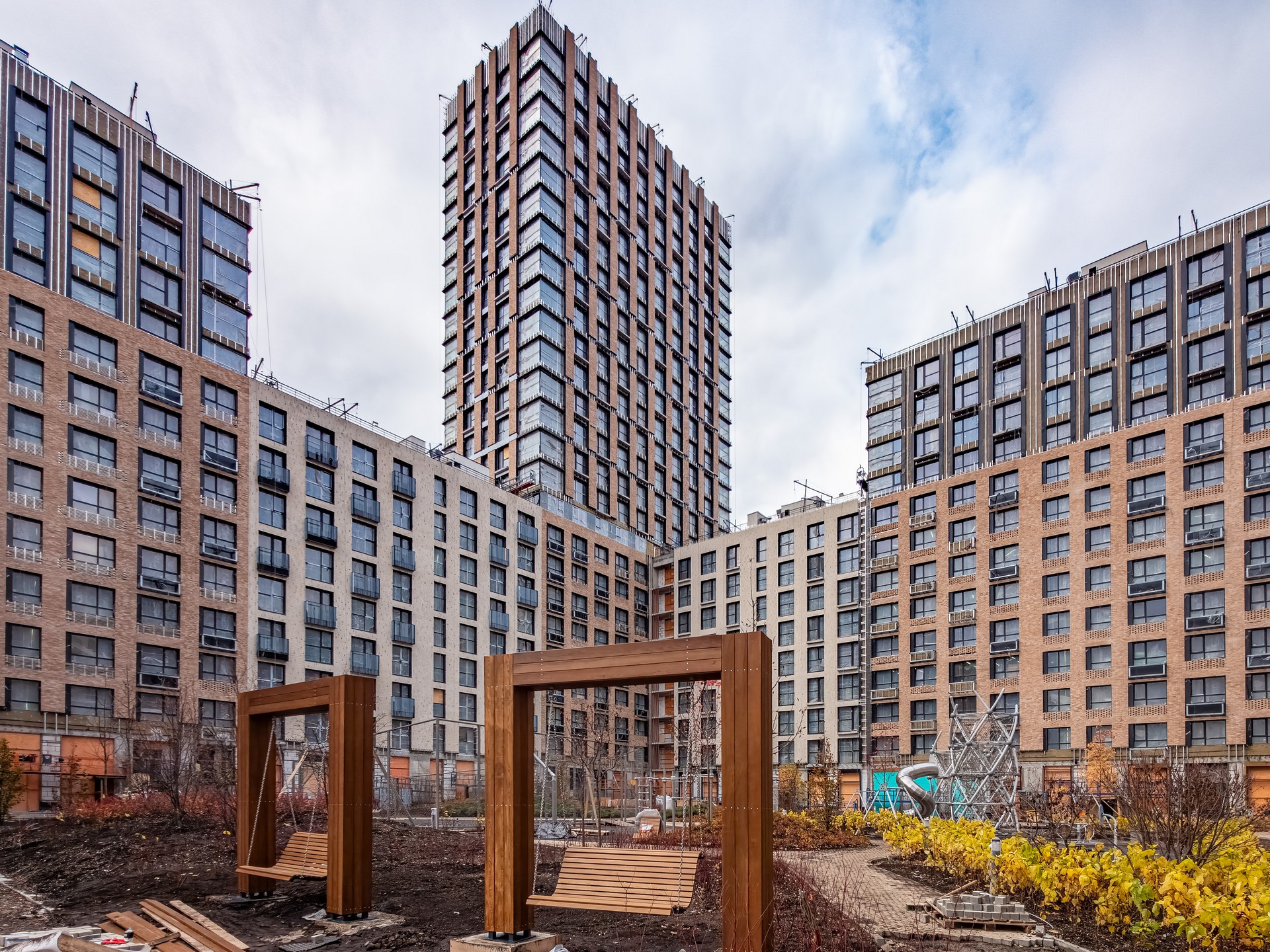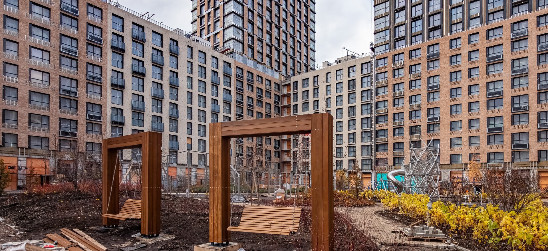 Во внутреннем дворе корпуса 1 установлено 90% малых архитектурных форм, среди которых – площадка для воркаута, беседки, горки, гамаки и качели. Озеленение выполнено на 70%: высажены крупномерные лиственные деревья, кустарники, разбиты цветники и уложены газоны. На бульваре брусчаткой вымощен основной объем дорожки-змейки. Весной благоустройство продолжится.