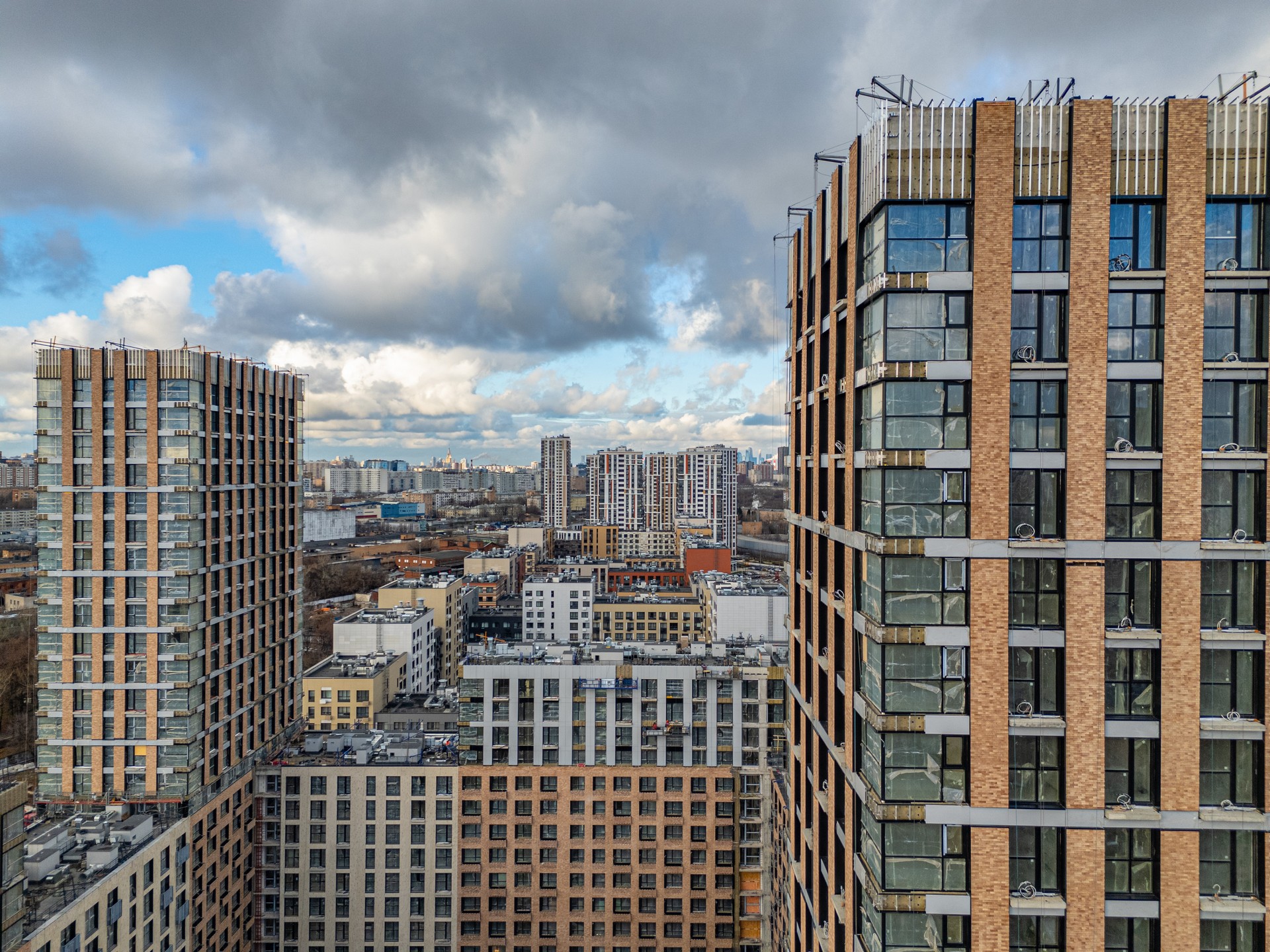 На двух корпусах четвертой очереди жилого квартала LIFE Варшавская продолжается монтаж фасадов: на 40% установлены витражи первых этажей и на 80% – декоративная плитка.